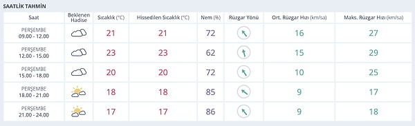 Meteoroloji verilerine göre İzmir’de sabah 09.00’da sıcaklık 21 derece olarak ölçülüyor. Nem oranı yüzde 72 seviyesinde seyrediyor. İlerleyen saatlerde ise sıcaklığın arttığı görülüyor. Saat 12.00 itibarıyla sıcaklığın 23 derece yükselmesi bekleniyor. Genel olarak parçalı bulutlu bir hava hakimken saat 18.00’den sonra yer yer güneşli bir hava hakim olacak. Öte yandan rüzgar hızının 8 km/sa seviyelerinde olması bekleniyor.
