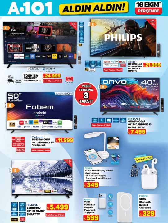 A101 aktüel kataloğu ile yeni ürünler, raflara eklenmeye hazırlanıyor. 16 Ekim 2025 Perşembe A101 broşürü ile yine çeşit çeşit ürün satışa sunulacak. A101 indirim afişi içerisinde; powerbank 599 TL, 65′ UHD VIDAA TV 24.999 TL, 65 L mekanik silindirik termosifon 6.999 TL, elektrikli bisiklet 19.990 TL, şarjlı lazer metre 999 TL, şarjlı vidalama 999 TL, 8 başlıklı saç şekillendirici 5.999 TL, kırışıklık giderici masaj aleti 749 TL, oyuncu koltuğu 2.799 TL, yedekli tüy toplama rulosu 125 TL, 2’li stantlı sıvı sabun seti 339 TL, kaydırmaz tepsi 79,50 TL, silikon servis gereçleri 89,50 TL, oyuncak eğlenceli ördekler 399 TL, kadın gülen yüz ev terliği 89,50 TL ile satış için raflarda hazır olacak. A101 Aldın Aldın aktüel kataloğu bu yine pek çok farklı ürünleri müşterilerin beğenisine sunacak. Peki A101 bu hafta yeni bülten ürünleri neler? İşte 16 Ekim 2025 A101 indirim afişi tamamı…