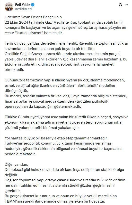 Milliyetçi Hareket Partisi (MHP) Genel Başkan Yardımcısı Feti Yıldız, sosyal medya hesabından yaptığı açıklamada, “Liderimiz Sayın Devlet Bahçeli’nin 22 Ekim 2024 tarihinde Gazi Meclis’te grup toplantısında yaptığı tarihi konuşmayla başlayan ve bu aşamaya gelen süreç, tartışmasız yüzyılın en cesur kurucu siyaset hamlesidir. Terör olgusu, çağdaş devletlerin egemenlik, güvenlik ve toplumsal istikrar kavramlarını derinden sarsan çok boyutlu bir tehdittir. Özellikle soğuk savaş sonrası dönemde uluslararası sistemin parçalı yapısı, devlet dışı silahlı aktörlerin güç kazanmasına zemin hazırlamış; bu aktörlerin çoğu etnik, dini veya ideolojik motivasyonlarla hareket etmektedir. Günümüzde terörizmin yapısı klasik hiyerarşik örgütlenme modelinden, esnek ve dijital ağlar üzerinden yürütülen ‘hibrit tehdit’ modeline dönüşmüştür. Bu model, terörün yalnızca fiziksel değil, aynı zamanda bilişim sistemleri, finansal ağlar ve sosyal medya üzerinden yürütülen psikolojik operasyonları da kapsadığını göstermektedir” ifadelerini kullandı.
